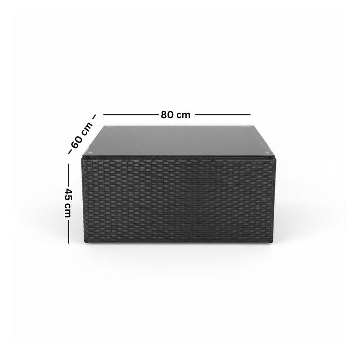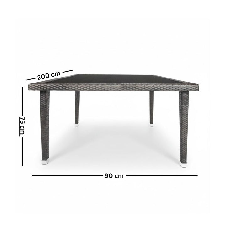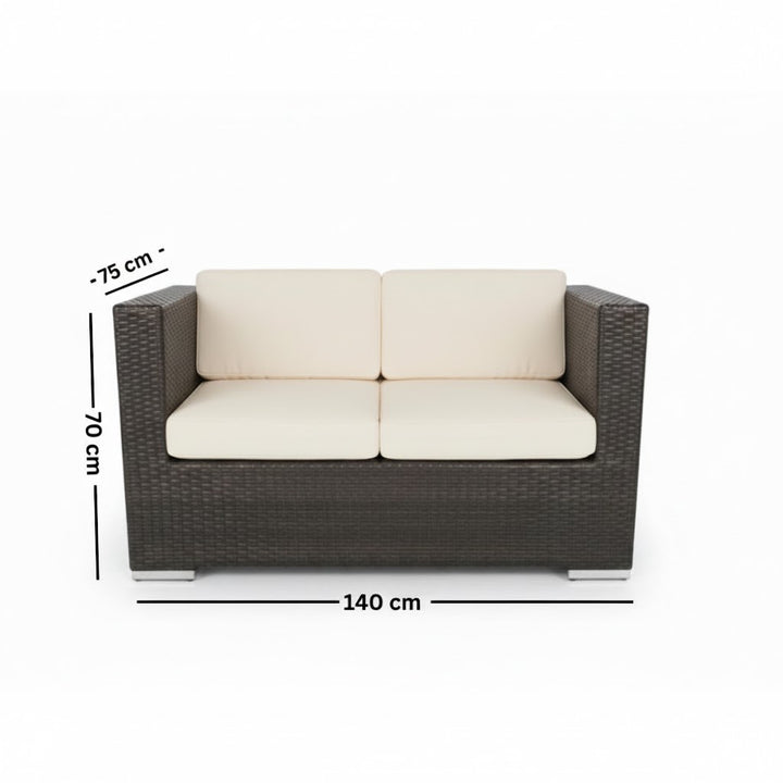 You can now get the diverse Alexander set, which consists of a dining set for 8 people, 2 chaise lounges, 6 chairs, 2 poufs, and a table. This set is designed to fit large spaces and is distinguished by its durability as it is made from weather-resistant treated rattan.